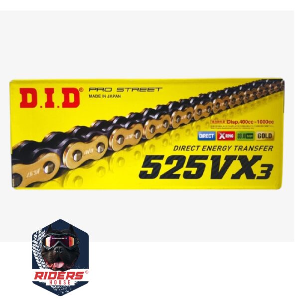 La Cadena DID VX3 525×130 Dorada con X-Ring es una cadena de alta calidad, fabricada 100% en Japón, diseñada para motos de 400cc a 1.100cc. Su tecnología X-Ring reduce la fricción, mejora la eficiencia de la transmisión de potencia y aumenta la durabilidad, mientras que su acabado dorado le da un toque premium y elegante a tu moto.